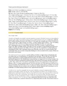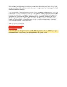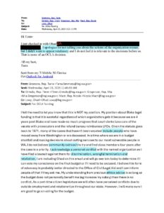 community outreach regarding implementation of the Blake Decision. In my communications with my colleagues during budget deliberations, prompted by an email from a constituent advocating for these funds to be directed away from my former organization with specific allegations of harm to its own clients, I wrote that “in a time where we are in a budget shortfall and making decisions about cutting services to our most vulnerable people in WA, I do not believe community outreach to try and find [Blake] class members four years after the case is a priority.” The external email I was responding to copied me on an outreach to members and staff of the budget committees in both the House and Senate. I wanted to steer that conversation away from the specific organization and to a collaborative assessment of the community outreach portion of the funding itself given the progress that has been made in the last four years to set up government systems for individuals to access Blake relief. I also wanted to disclose a potential conflict of interest and add House Ethics Counsel to the thread to ensure I was being ethical in light of my prior public lawsuit against my former organization for retaliation, wrongful termination and discrimination. I had already received one settlement for past harms, and was unfortunately in the position of having to fight for my own rights through a civil lawsuit. I needed more eyes on my position to ensure it wasn’t grounded in emotion because I am a human who values transparency and integrity. Since I am not on a budget committee or part of budget negotiations; I have no voting ability until the final budget is released but do my best to help the budget writers identify potential redundancies to preserve critical services.